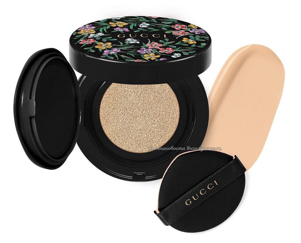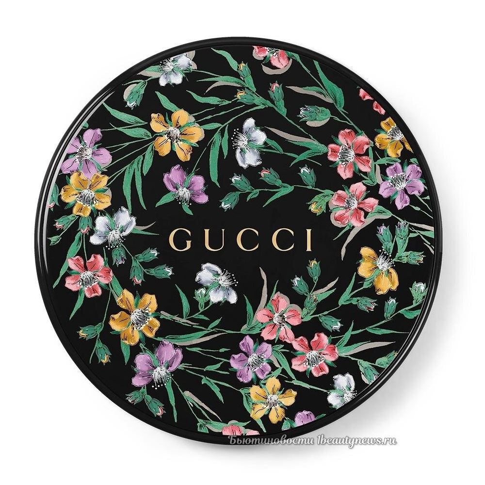 Главной особенностью новинки стал роскошный черный футляр, украшенный золотыми деталями и фирменным цветочным узором Gucci. Благодаря встроенному зеркальцу кушон удобно использовать в дороге, чтобы быстро поправить макияж.