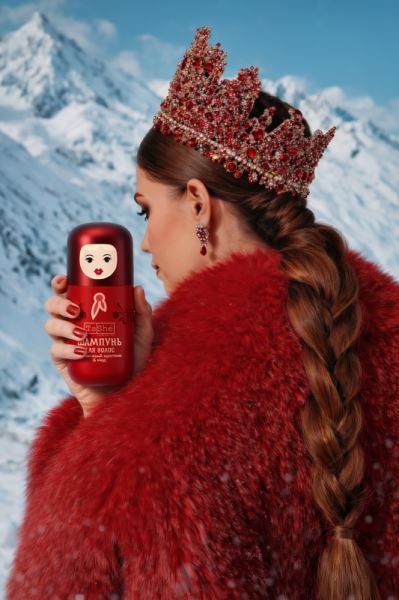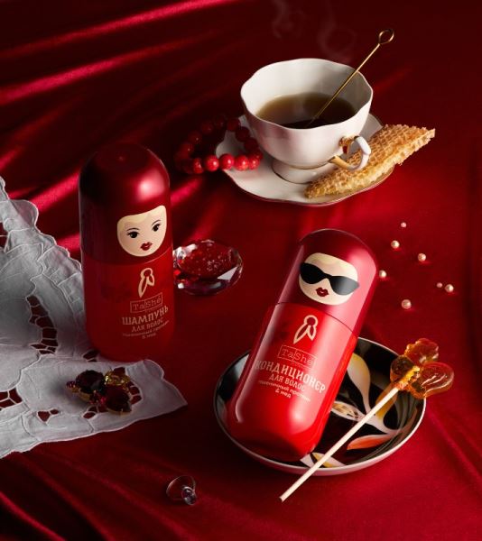 Флаконы, стилизованные под матрешки, стали отдельным акцентом: эргономичная форма и яркий алый цвет делают их яркой деталью на полке в ванной или отличным подарком подруге.