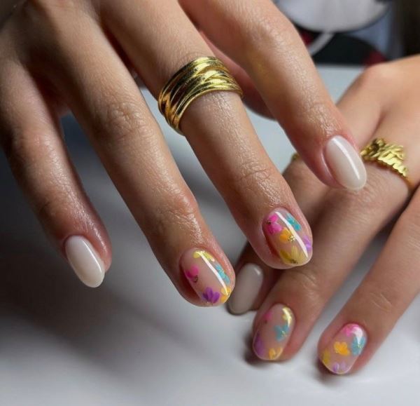 В пастельной гамме цветы шикарно смотрятся на коротких ногтях: они не перегружают, а только добавляют образу хрупкости и свежести. Самый эффектный прием – полупрозрачные, будто тающие лепестки на нейтральном фоне.