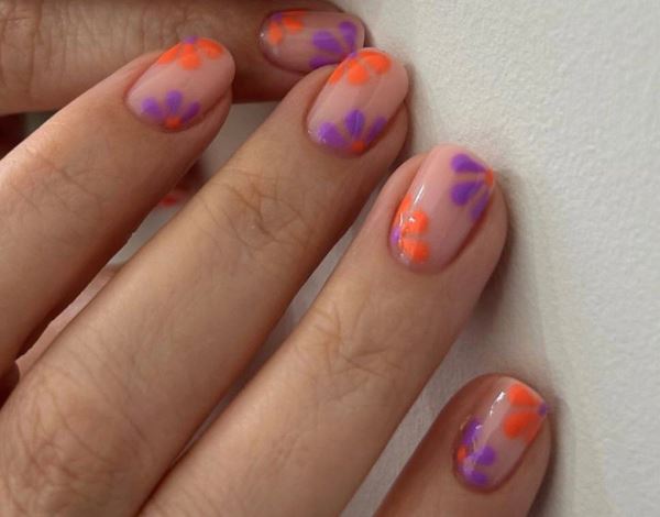 Большие цветы проще всего нарисовать самостоятельно, поэтому, если вы предпочитаете домашний маникюр, – это ваш лучший вариант. Попробуйте необычные сочетания лаков: например, неоновый оранжевый и фиолетовый на максимально нейтральном фоне.