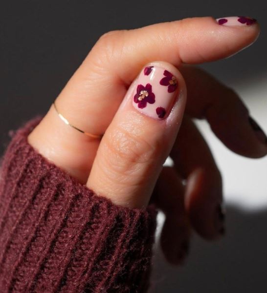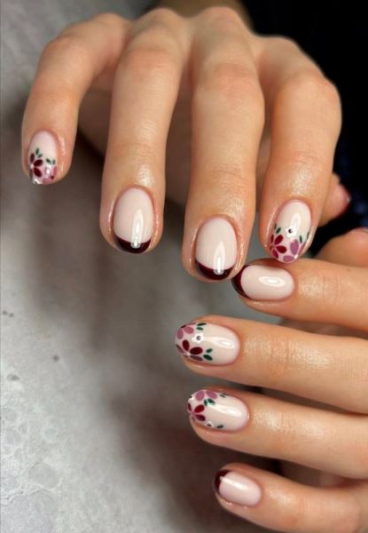 Бордовый френч, украшенный нежными цветами в тон, смотрится сдержанно и вместе с тем по-весеннему. Попробуйте сочетать его с базовым лаком в цвете года по версии Pantone – Cloud Dancer («Облачный танцор»).
