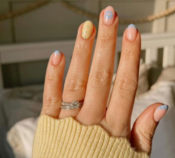 Актуальный вариант – сочетание пастельных оттенков в маникюре с цветочным дизайном и цветным френчем. Добавить к этому модный полька-дот – и получается весеннее настроение на кончиках пальцев!