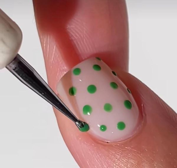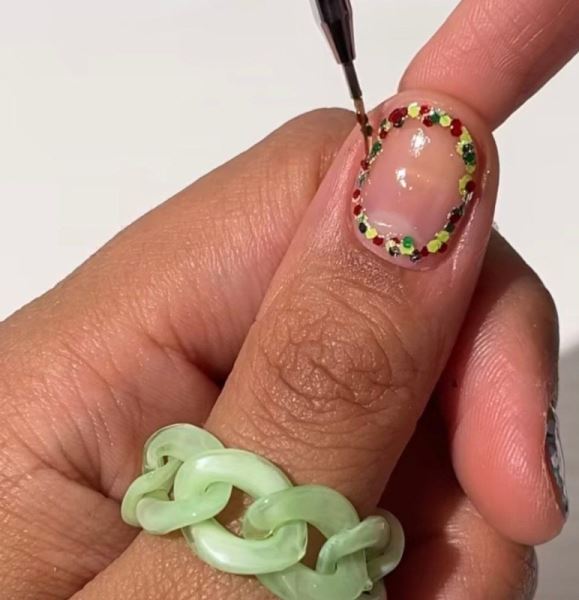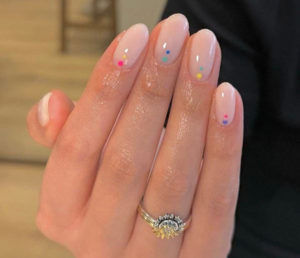 Нежный вариант для минималистов, способный сделать более позитивным привычный нюд, – нарисованные пару цветных точек у линии кутикулы.