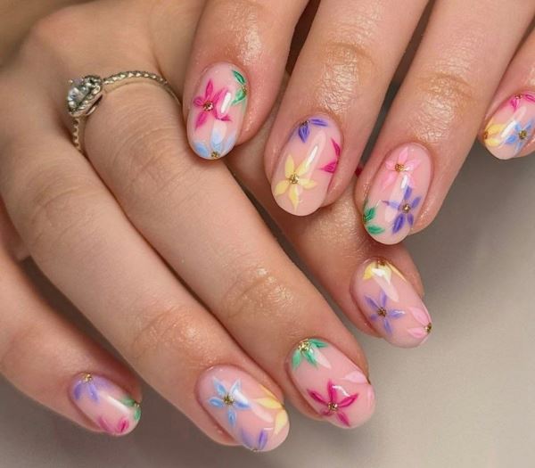 Что, если весеннее настроение уже захлестнуло с головой, и хочется совместить идею с конфетти с флористическими мотивами? Цветы разных оттенков, хаотично нарисованные на ногтях, смотрятся невероятно эстетично и повышают настроение не только в преддверии 8 Марта, но и в течение всего весенне-летнего сезона.