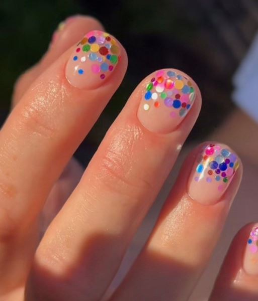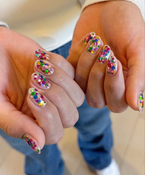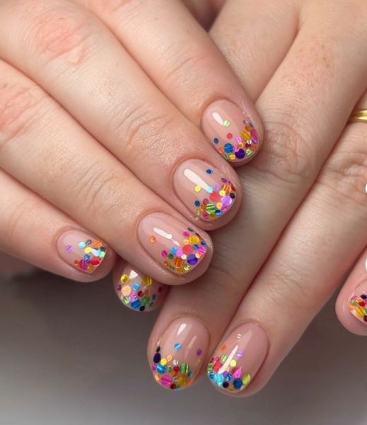 Особенно хорошо такие дизайны смотрятся на прозрачной или нюдовой базе: конфетти не перегружает, а лишь добавляет маникюру объема и движения.