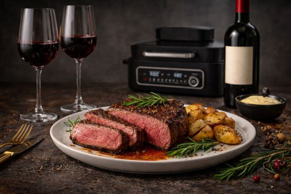 Стейк заранее достать из холодильника, чтобы он стал комнатной температуры. Натереть солью, перцем, оливковым маслом, добавить раздавленный чеснок и розмарин, оставить мариноваться на 20-30 минут. Разогреть аэрогриль до 200°C, выложить мясо на решетку и готовить 8-12 минут в зависимости от желаемой прожарки, перевернув один раз. После приготовления дать стейку «отдохнуть» 5 минут, чтобы соки распределились внутри.