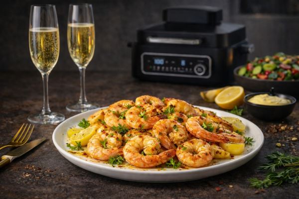 Смешать масло, лимонный сок, измельченный чеснок, соль и чили. Залить креветки маринадом и оставить на 10-15 минут. Выложить в корзину аэрогриля одним слоем и готовить при 180°C 6-8 минут до появления приятного розовато-золотистого цвета. Перед подачей посыпать свежей петрушкой и при желании сбрызнуть еще лимоном.