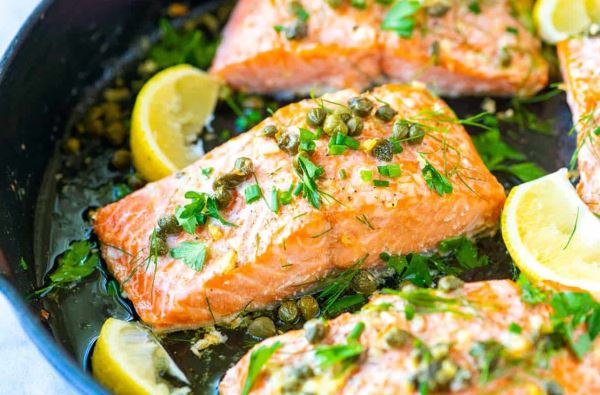 Обжарьте лосось на сковороде до золотистой корочки, уберите в сторону. В той же сковороде растопите масло, добавьте мелко нарезанный чеснок, каперсы и сок половины лимона. Верните рыбу, прогрейте пару минут и подавайте, сбрызнув свежим лимонным соком.