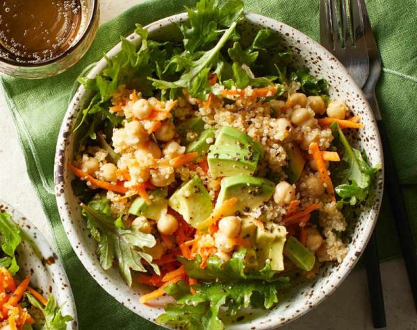 Киноа дает растительный белок, авокадо — полезные жиры, зелень насыщает магнием и фолатами.