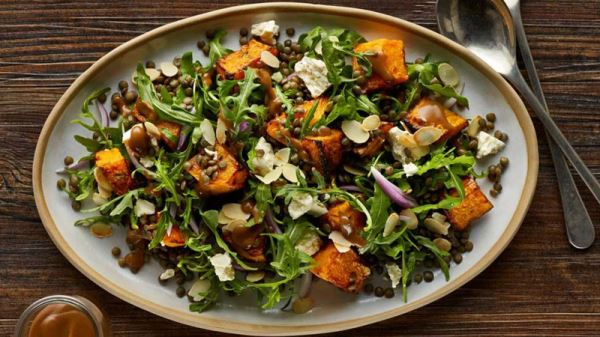 Теплый салат из запеченной тыквы и чечевицы