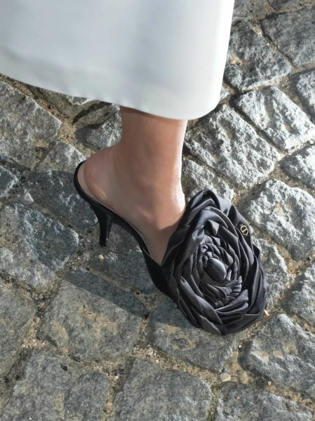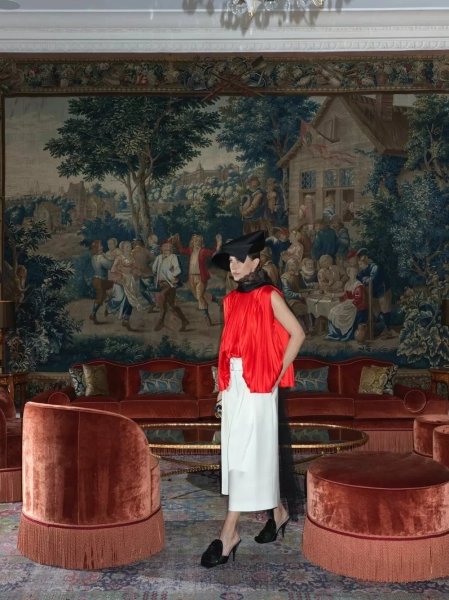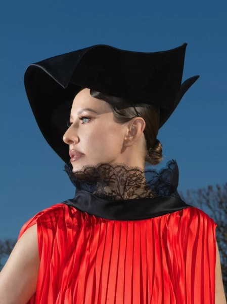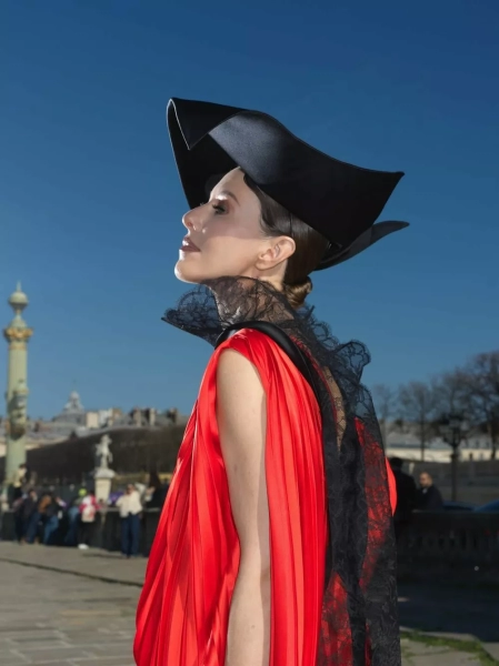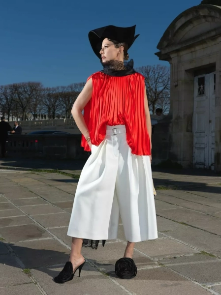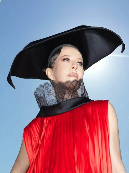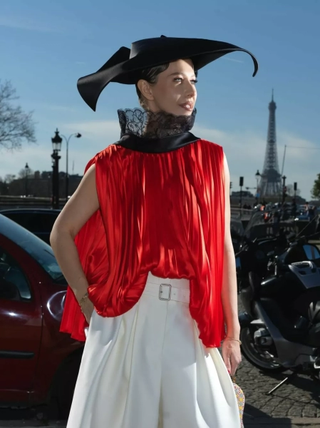 Для показа мы со стилистами выбрали алую блузу с плиссировкой и кружевной вуалью (отсылка к платью Dior, созданному Ивом Сен Лораном в 1960 году), белые кюлоты, мюли с розой, шляпу (было много вариантов, но выбрала вот эту черную треуголку с интересной геометрией) и архивную сумку Dior saddle bag, расшитую бисером — ей много лет, — написала Собчак.
