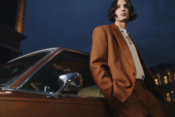 Мужская коллекция включает 23 предмета гардероба: верхнюю одежду, костюмы из шерстяных тканей, трикотаж и деним. Линейка построена вокруг лаконичных форм, сдержанной цветовой палитры с акцентами и сочетает классические элементы мужского гардероба с современными пропорциями и материалами. Обувь представлена классическими лоферами и полуботинками из натуральной коричневой замши.