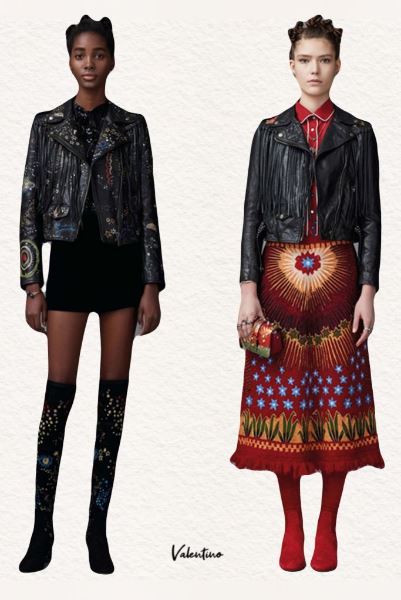 Alexander McQueen, Valentino Разнообразие моделей и сочетаний представил Valentino. Во время показа осень-зима 2016 на подиуме появились как киберпанковские объемные варианты, так и модели в стиле бохо. Alexander McQueen, в свою очередь, сочетал косухи с юбками-пачками, украшая обилием стразов и брошек.