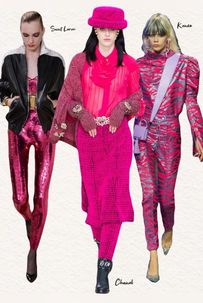 Гламурную фуксию бренды обыграли по-своему. Рейв-блестки Saint Laurent и эпатажные образы Kenzo напоминают о вечеринках, гремевших в модных столицах 10 лет назад. А Карл Лагерфельд вписал его в привычную для ДНК Chanel классику.