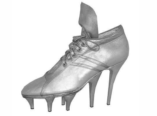 Однако чаще всего вывод футбольной или фанатской атрибутики со стадионов на подиумы не означает какой-то серьезной работы над их переосмыслением и интеграцией, а решает скорее задачу привлечь внимание к брендам и их коллекциям. Например, дерзким экспериментом в 1993 году стала переработанная Жан-Полем Готье модель футбольных бутсов с многосантиметровыми шипами. Свою интерпретацию специализированной обуви представил спустя восемь лет Miu Miu, поместив бутсы на короткие декоративные шипы и невысокий каблук. Сезоном позже похожий прием использовали и Comme des Garçons с Nike, совместно переработав дизайн классических футбольных бутс Nike Premier, акцентной деталью которых стал массивный каблук необычной формы. Еще более смелым экспериментом год спустя стали ботинки в коллаборации adidas с парижским брендом BOTTER, состоящие из двух частей: их платформа выполнена в виде обычного ботинка дерби, который как будто придавлен сверху наступившей на него футбольной бутсой.