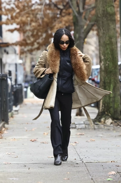 В этот раз Зои выбралась на прогулку в одиночестве – без нового бойфренда Гарри Стайлса, с которым в последнее время все чаще попадается на глаза папарацци. В своем повседневном образе актриса сочетала коричневую афганскую дубленку в винтажном стиле и технологичную черную ветровку Arcteryx с черными расклешенными брюками, черными ботильонами на каблуке и черными аксессуарами.