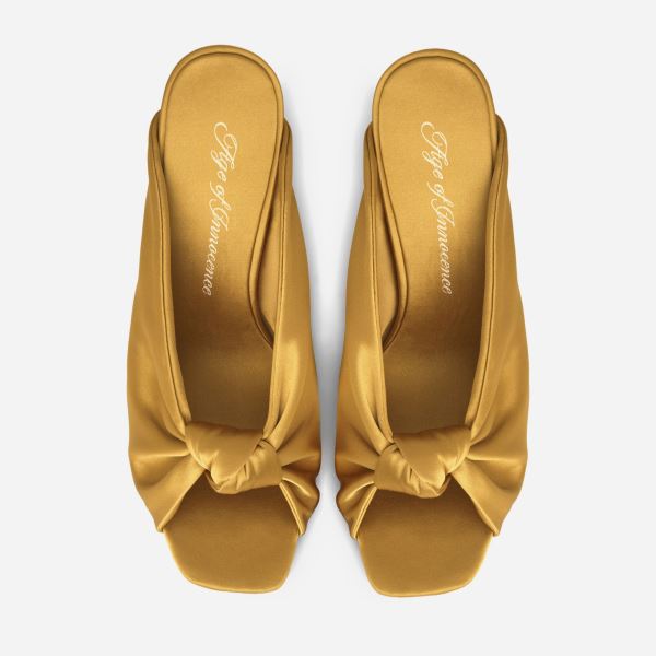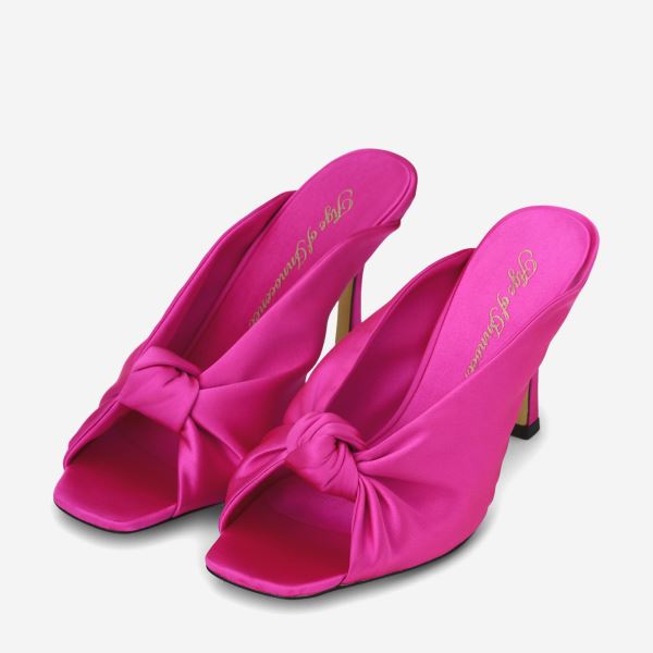 Одной из самых выразительных моделей стали сатиновые мюли Cindy с квадратным мысом, глубоким вырезом и бантом-узлом, выпущенные в цвете фуксии и мягком горчичном оттенке.