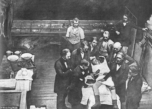 На этой фотографии запечатлен первый случай, когда пациента усыпили с помощью анестезии. Операция проводилась в Гарвардском университете в Бостоне, США. В Великобритании анестезию впервые применил Роберт Листон. Источник изображения: dailymail.co.uk